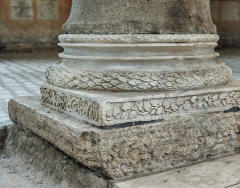 - Plinthe alternierend mit Spiralranken und Eichenblattranken auf den Seiten, darauf Basis mit Wulst mit Lorbeerstab unten und Blattstab oben, dazwischen tief unterschnittene Profilierung.