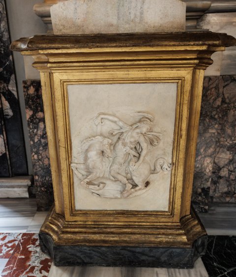 - aus einem Sarkophagrelief ausgeschnittene Figur, Vorderbeine u. Schwanz des Pferdes u. rechter Arm der Amazone ergänzt, Kopf u. Knie der Amazone sowie Hinterbeine des Pferdes überarbeitet