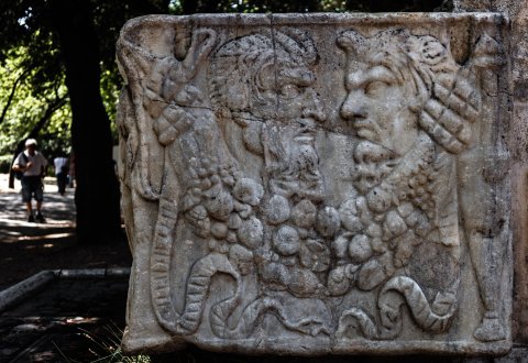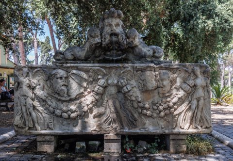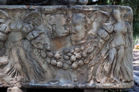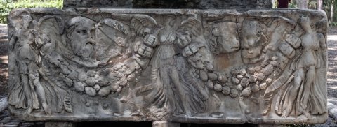 Girlandensarkophag: auf der Vorderseite zwei Girlanden, getragen von drei Victorien, in den Girlandenbögen links zwei bärtige Köpfe, rechts zwei jugendliche (Mänade und Satyr).