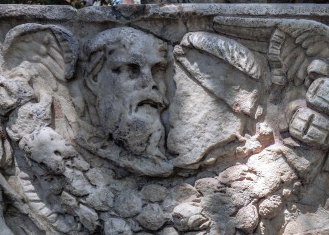 Auf den Schmalseiten je eine Girlande, an der hinteren Ecke an einem Gefäß befestigt; in den Girlandenbögen je zwei Profilköpfe, links bärtiger Satyr und Mänade, rechts Pan und Satyr.