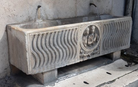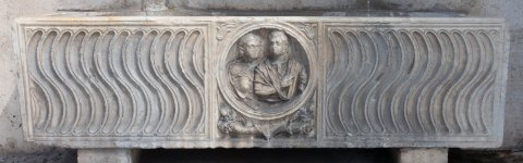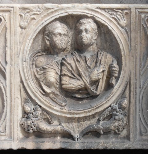 - In der Mitte der Längsseite zwischen zwei Riefelzonen rundes Portraitmedaillon mit Büsten einer Frau und eines Mannes (Ehepaar), Volumen in der linken Hand des Mannes. In den Zwickeln über dem Medaillon je eine Blüte, in den Zwickeln darunter je ein Füllhorn mit Akakanthusblättern und Pinienzapfen. Seitenflächen unverziert.