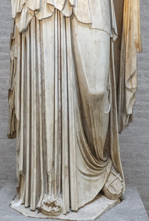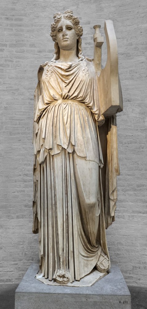 - Mythische Figur, Musikinstrument: stehender Apollo im gegürteten Peplos und über den Rücken fallendem Mantel, Frisur mit Haarschleife und langen Schulterlocken, in der linken Hand Kithara. Römische Kopie, Original 4. Jh. v. Chr.