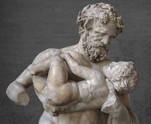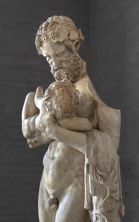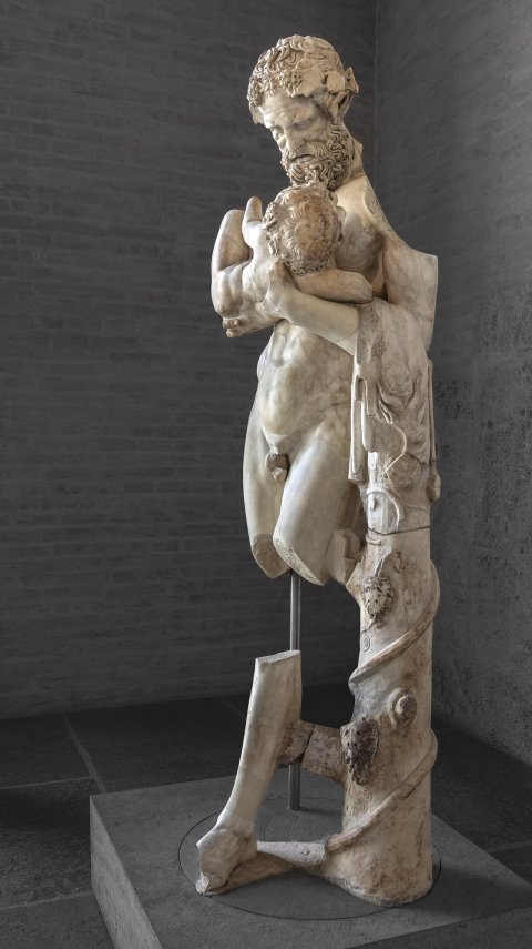 - Mythische Figuren: bärtiger Silen mit Weinlaubkranz, linker Arm auf Baumstamm mit Weinranken gestützt, hält mit beiden Händen das Dionysoskind; römische Kopie nach Original aus der 2. Hälfte des 4. Jhs. (Lysipp ?).