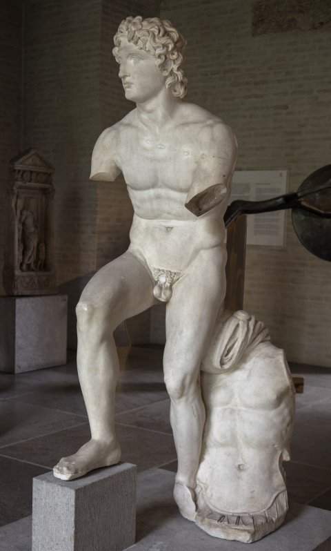 - Historische Person: Alexander d. Gr., nackt, rechter Fuß hochgestellt, neben dem linken Bein Brustpanzer. Römische Kopie, Original um 330 v. Chr.