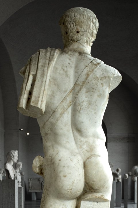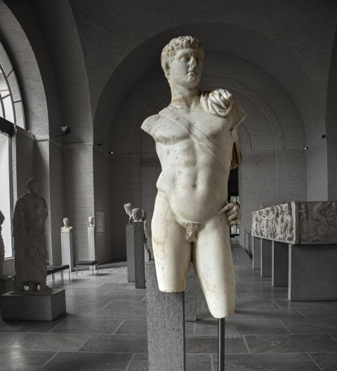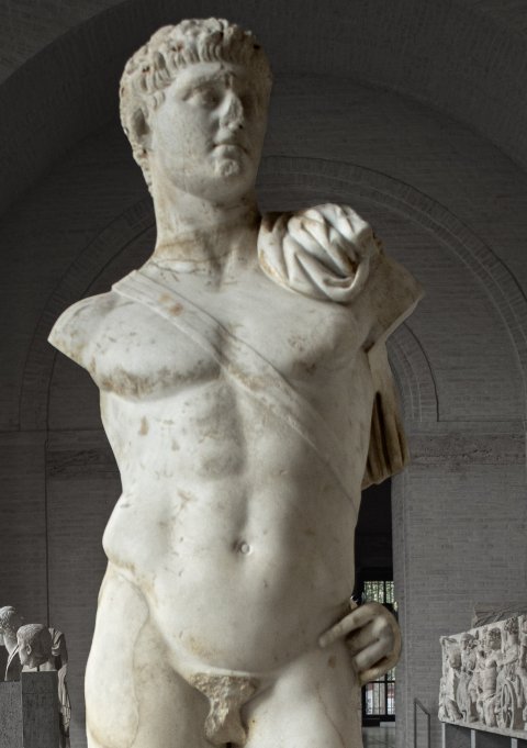 - Historische Person: nackte Statue des Nero mit Schwertband und Mantel auf der linken Schulter, linke Hand in die Hüfte gestützt; Porträtkopf zu Domitian (?) umgearbeitet, Gesicht bestoßen