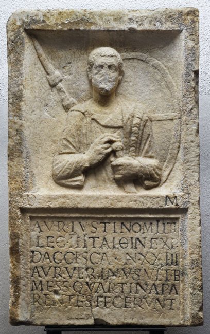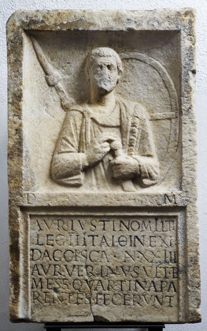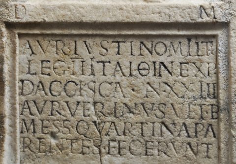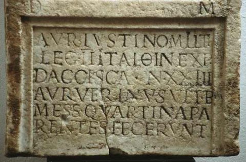 - D(is) M(anibus) / Aur(elio) Iustino militi / leg(ionis) II Ital(icae) o(bito) in exp(editione) / Daccisca (!) an(norum) XXIII / Aur(elius) Verinus vet(eranus) et / Mess(ia) Quartina parentes fecerunt