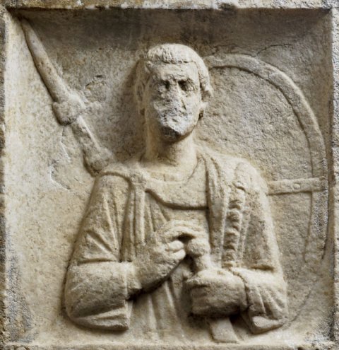 - In Rechtecknische Halbfigur eines Mannes (Soldat): bartlos, Ärmeltunica, Sagum mit Fransen, Scheibenfibel. Waffen: Schwert ?(Griff mit Knauf in der Linken, Schneide nicht sichtbar ?), Ovalschild, Lanze.