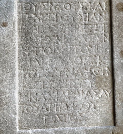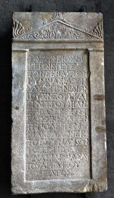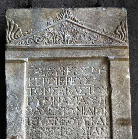 griechisch: Γ. Σαύφeιος Μά/κερ ὁ ἱερεὺς / τῶν Σεβαστῶν /