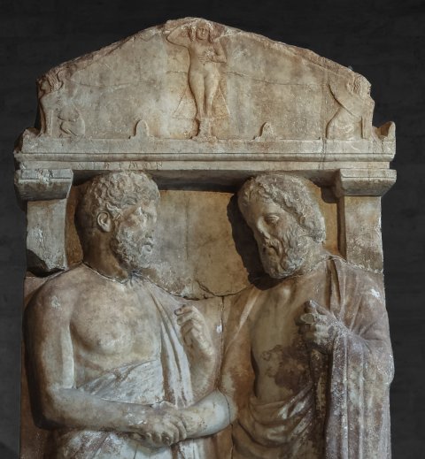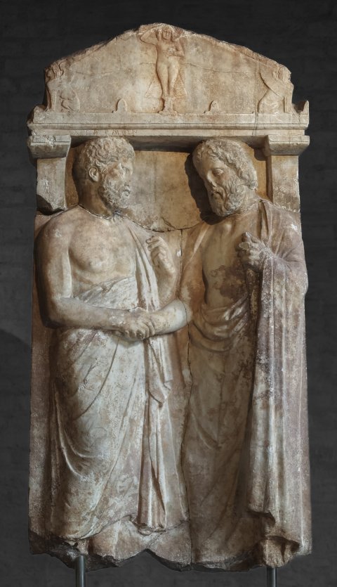 - Stele mit Giebel, darin in der Mitte auf Podest stehende Sirene, an den Ecken hockende Sphinx. Darunter Dachrand mit Antefixen, Architrav auf glatten Pfeilern. Zwei stehende bärtige Männer, die sich die Hand reichen, beide im Mantel, Oberkörper entblößt. Der ältere mit Stab in der Linken, wohl Vater des Verstorbenen.