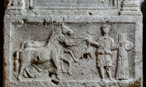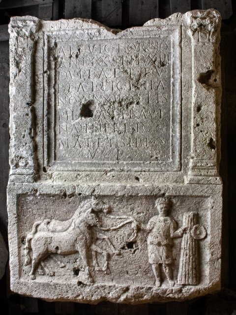 - Schriftfeld zwischen Pilastern. Sockelbild: Calo hält mit der Rechten zwei Pferde, rechts Bündel aus Speeren (?) und Patera (?).