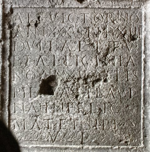 - D(is) M(anibus) // Ael(io) Victorino / ann(orum) XXX stip(endiorum) XIII / dupl(icario) al(a)e I T(hracum) v(eteranae) / et Ael(io) Licinia/no an(norum) XII fili(i)s / pien(tissimis) Ael(ia) Flavi/na infelic(issima) / mat(er) et sibi / v(iva) p(osuit)