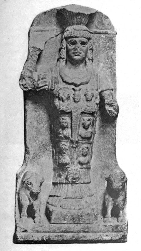 - Mythische Figur (Jupiter Heliopolitanus): stehender Gott zwischen zwei Stieren, den rechten Arm erhoben, den linken vor dem Körper ausgestreckt, in der Hand eine Peitsche, der Körper ist gepanzert und mit Darstellungen von Büsten geschmückt. Diese stellen wahrscheinlich Gottheiten dar. Die obersten können als Apollo und Diana bzw. Selene gedeutet werden. Um den Hals eine Kette mit Scheibe und zwei Uräusschlangen. Am Kopf trägt er einen Kalathos, die Haare auf orientalische Art gestaltet. Die Augen waren in einem anderen Material (Email?) eingesetzt und sind heute verloren.