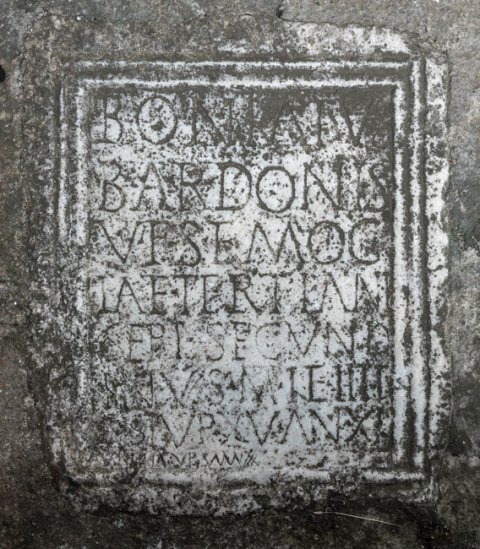 - Boniatus / Bardonis (filius) / v(ivus) f(ecit) s(ibi) e(t) Mog/iae Terti (filiae) an(norum) L / Sept(imius) Secund/inus m(iles) le(gionis) II It/a(licae) stup(endiorum) (!) XV an(norum) XL / Aurelia Ursa an(norum) XXX