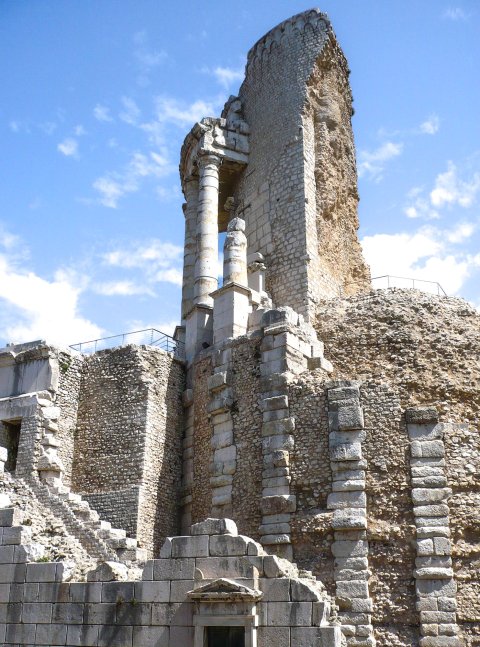 Der Monopteros hat die Familie des Augustus und seine Heerführer verherrlicht. An seiner Außenwand befanden sich Nischen für Statuen. Hierher lassen sich einige Statuenfragmente, wahrscheinlich von Mitgliedern der kaiserlichen Familie, aber auch von Heerführern zuweisen, v.a. ein qualitätvoller Porträtkopf des Drusus, des Siegers über die Räter lupa.at/xxx.