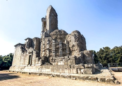 Rekonstruiert sind Teile der Verkleidung des Ungeschosses, des Podiums und Teile der Säulenhalle mit Gebälk.