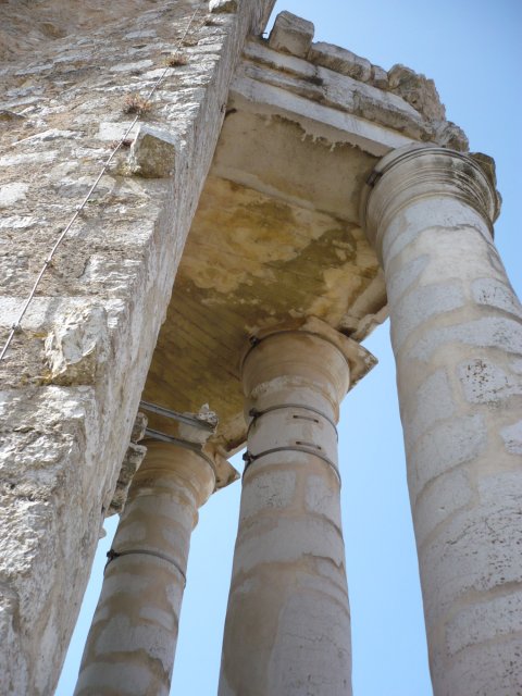 Über den Säulen Gebälk mit Metopenfries(lokaler Kalkstein).