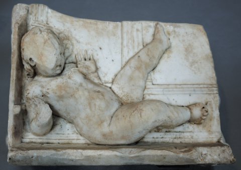 - Mythische Figur: auf den Rücken fallender nackter Erot, im Hintergrund Podest mit kannelierten Pilastern. Fragment eines Reliefs mit dem leeren Thron für Dionysos.