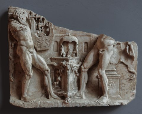- oben abgebr., bestoßen, Reliefteile abgebr.