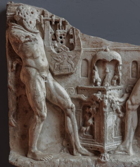 Mythische Figuren, Musikinstrument: zwei einander gegenüber stehende, zurückgeneigte Satyrn, nackt bis auf Nebris; der Linke ist bärtig und spielt eine mit Greifenrelief verzierte Kithara. Zwischen beiden vierseitiger Kasten mit Löwenfüßen, in den sichtbaren, einwärts gewölbten Wänden Bogennischen mit Relieffiguren; oben eckiges Podest mit rundem Baldachin, der von Sphingen (?) getragen wird.