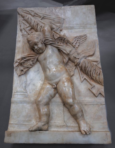 - Mythische Figur: Erot schleppt ein großes Blitzbündel auf dem Rücken; im Hintergrund Podest mit kannelierten Halbsäulen. Fragment eines Reliefs mit dem leeren Thron für Jupiter.