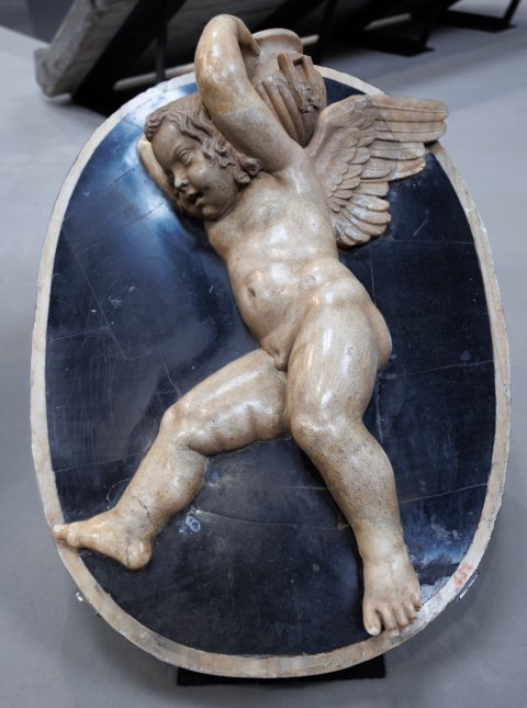 - Mythische Figur: nackter Erot, der einen Kantharos auf dem Nacken trägt. Fragment eines Reliefs mit dem leeren Thron für Dionysos.
