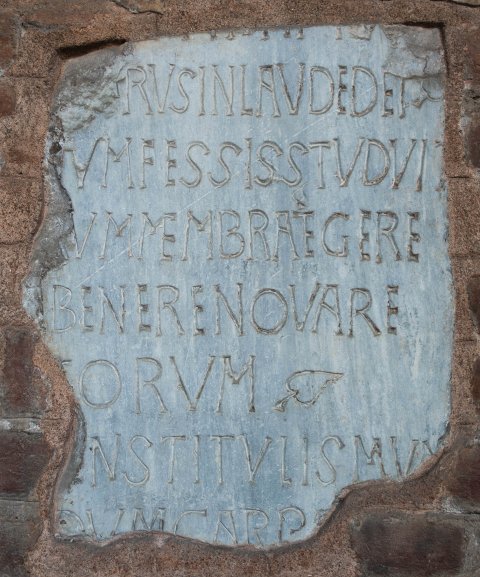 - ---]IIIIIAIE / [---]arus in laude dei / [---]um fessis studuit / [---]aum membra tegere / [---]a bene renovare / [---]forum / [---]ens tituli mun/[---]dum carpe