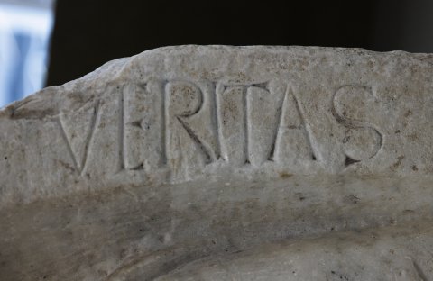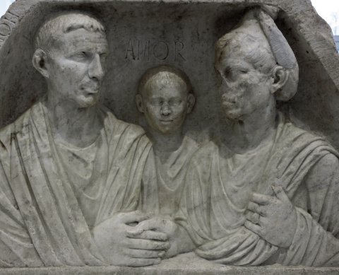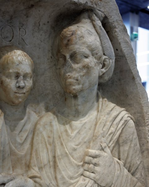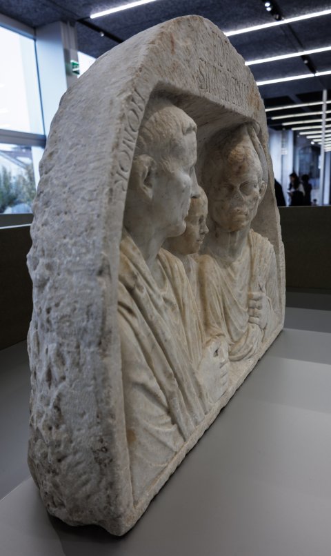 - Stein mit halbrundem Abschluss, darin Bildnische mit Halbfiguren einer Familie: Ehepaar, zwischen ihnen Kind (Knabe). Bartloser Togatus, Frau mit Fingerring.