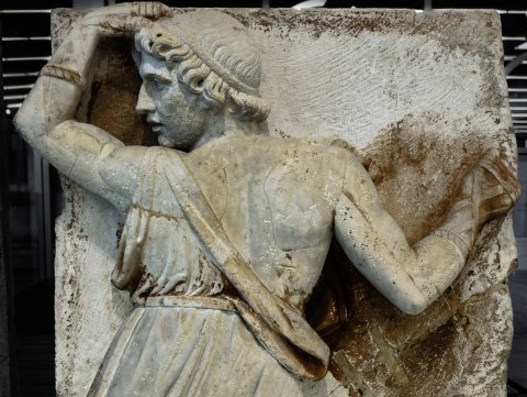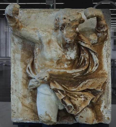 - Zwei miteinander kämpfende Männer, links bärtig in lose umgeschlungenem Mantel, der rechte jugendlich in gegürteter Tunica, die die rechte Schulter freilässt; beide mit Binde im Haar. Mythos ? (Faustkampf zwischen Dares und Entellus, Aeneis 5, 362 ff.).