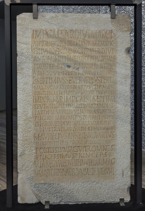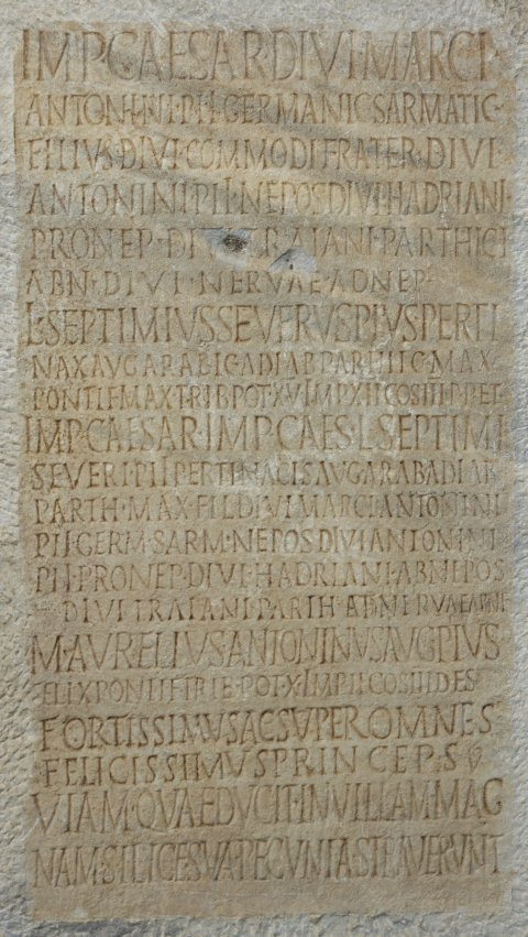 - Imp(erator) Caesar divi Marci / Antonini Pii Germ(anici) Sarmatici / filius divi Commodi frater divi / Antonini Pii nepos divi Hadriani / pronep(os) divi Traiani Parthici / abn(epos) divi Nervae adnep(os) / L(ucius) Septimius Severus Pius Perti/nax Aug(ustus) Arabic(us) Adiab(enicus) Parthic(us) max(imus) / pontif(ex) max(imus) trib(unicia) pot(estate) XV imp(erator) XII co(n)s(ul) III p(ater) p(atriae) et / Imp(erator) Caesar Imp(eratoris) Caesaris L(uci) / Septimi Severi Pii Pertinacis Aug(usti) Arabici / Adiab(enici) Part(hici) max(imi) fil(ius) divi Marci Anto/nini Pii Germ(anici) Sarm(atici) nepos divi Anto/nini Pii pronepos divi Hadriani / abnepos divi Traiani Parth(hici) adne<p=R>(os) M(arcus) Aurelius Antoninus Aug(ustus) / Pius Felix pontif(ex) trib(unicia) pot(estate) X imp(erator) II co(n)s(ul) III des(ignatus) (!) fortissimus ac super / omnes felicissimus / princeps / viam quae ducit in villam magnam / silice sua pecunia straverunt