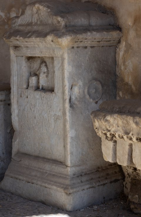 - Di{i}s Manibus / sacrum / Ti(berio) Claudio Acuto / aedituo aedis / Concordiae qui vixit / annis LXXXXVI sine ulla / offensa Iulia Classica bene / merito erga se et sibi libertis / libertabusque posterisque eorum / locus sepulc{h}ri continet / per cippos dispositos iuger(a) / quattuor et nubilare locus habitationis / tutela mon<u=I>menti