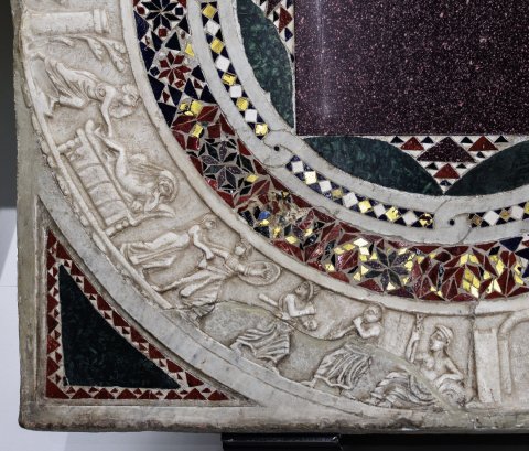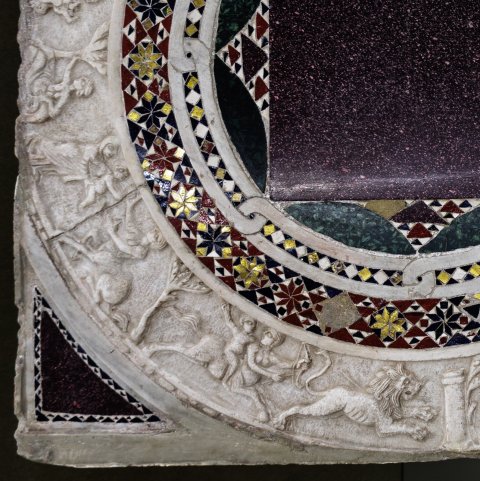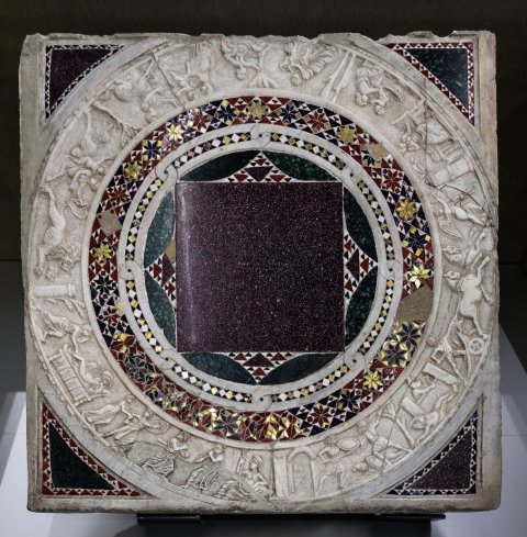 Mythos: quadratische Platte mit Marmorrand und kreisförmigem Relieffries, konzentrisch folgen Kreise mit ornamentalem Mosaik, in der Mitte und den Eckzwickeln Einlagen aus farbigem Stein.