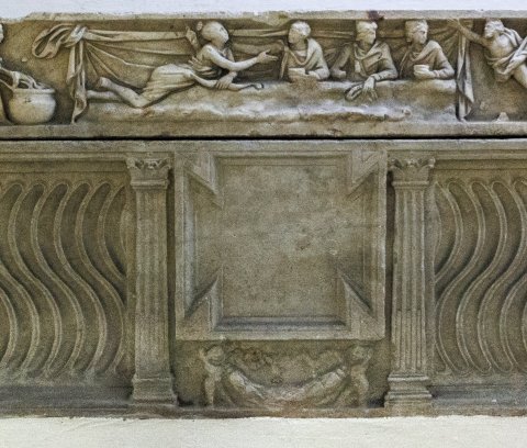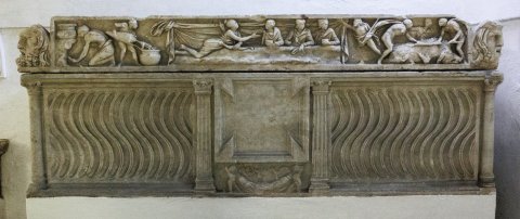 Auf der Kasten-Vorderseite gerahmte leere tabula ansata zwischen kannelierten Pilastern, unter der tabula von Eroten getragene Girlande; anschließend zu beiden Seiten Riefeln, an den Ecken glatte Säulen.