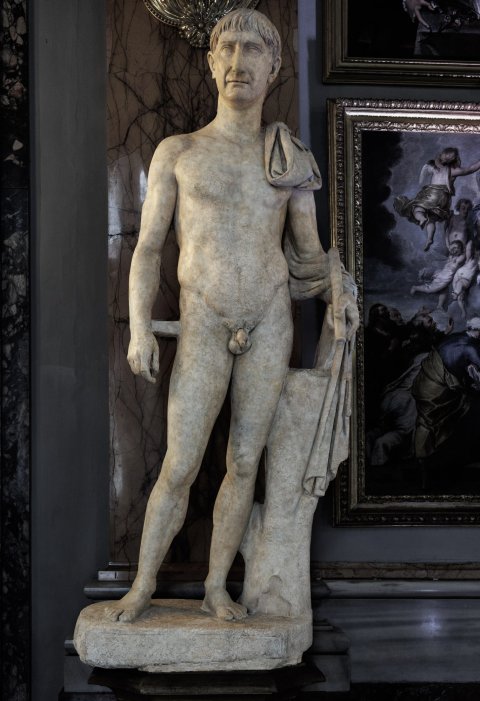 - Mythische Figur, historische Person: Statue des Hermes, Typus Richelieu, mit Mantel um den linken Arm, Baumstammstütze neben dem linken Bein. Ergänzt mit Porträtkopf des Trajan.