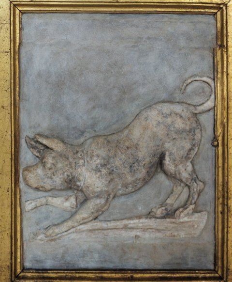 - rundum abgebr., in Statuenbasis eingefügt, ergänzt: Schnauze, Ohren, Glocke, linkes Vorderbein, Schwanz