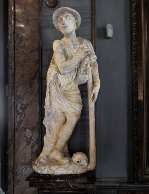 - ergänzt: Nase, rechter Arm, linker Unterarm mit Hand, Stock, Unterschenkel u. Füße. Plinthe mit Krug u. Eidechse