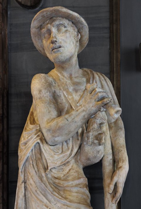- Auf einen langen Stock gestützter Hirte mit Hut und Beutel über der linken Schulter; kurzer Chiton (Exomis), hinter dem rechten Bein Baumstammstütze.