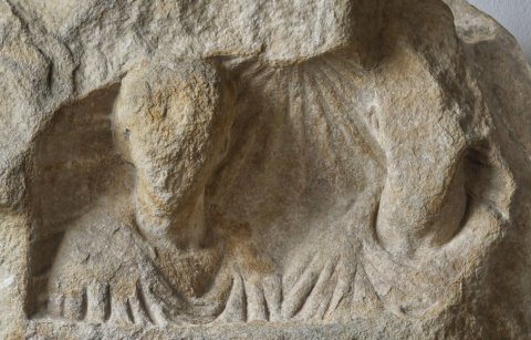 - Relief tlw. abgeschlagen, unten u. rechter Rand verbr., Oberseite rechteckig ausgehöhlt, Dübelloch, Bekrönung u. Sockel fehlen