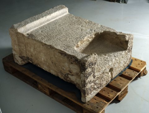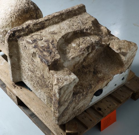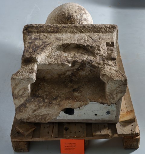 - in 2 Teile gebr., Inschrift verrieben, tief ausgehöhlte Bogennische, in der Unterseite rundes Dübelloch, Sockel fehlt