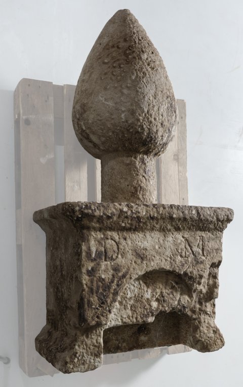 - Als Bekrönung Pinienzapfen, oberhalb der Inschrift Bogennische, die (sekundär ?) nach unten zu tiefer ausgehöhlt wurde.
