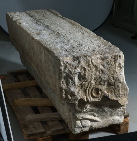 - bestoßen, links abgebr., in der Oberseite Dübel- u. Klammerloch