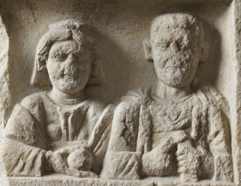 - Eingeschriebener Giebel mit Gorgoneion, auf den Schrägen Delphine. Im Hauptbild in Rechtecknische zwei Brustbilder (Ehepaar). Links Frau: Scheitelzopf. Halsband, Ärmeltunica, Gürtel, in der Rechten Apfel. Rechts Mann: bärtig, Ärmeltunica, Sagum, Scheibenfibel, in der Linken Rolle (volumen).