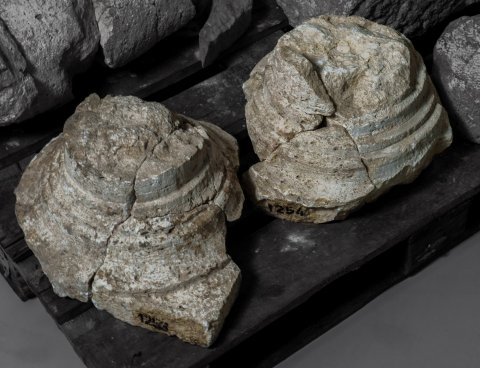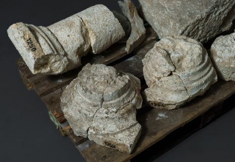 - Fragmente von 3 Säulenbasen u. glatten Säulenschäften
