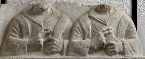Im Hauptbild zwischen Säulen Brustbilder von zwei Männern: Ärmeltunica, Paenula, Fingerring, in der Linken Rolle (volumen). Zwischenfries mit Efeuranken.