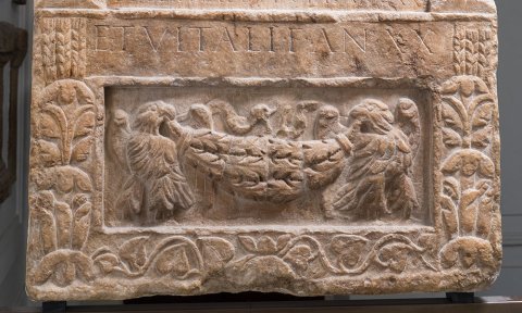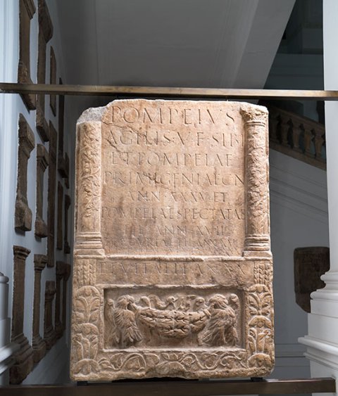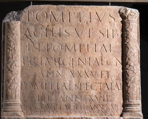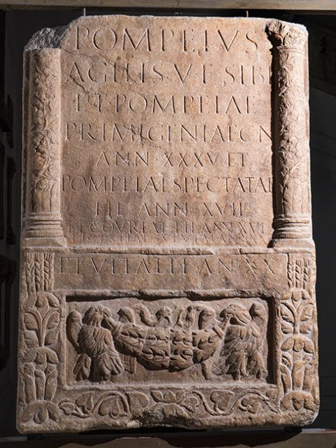 - Pompeius / Agilis v(ivus) f(ecit) sibi / et Pompeiae / Primigeniae con(iugi) / an(norum) XXXV et / Pompeiae Spectatae / fil(iae) an(norum) XVII / et Couriae fil(iae) ann(orum) XVI / et Sextiae Suputae ann(orum) XXX / et Vitali f(ilio) an(norum) XX