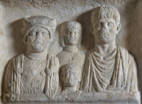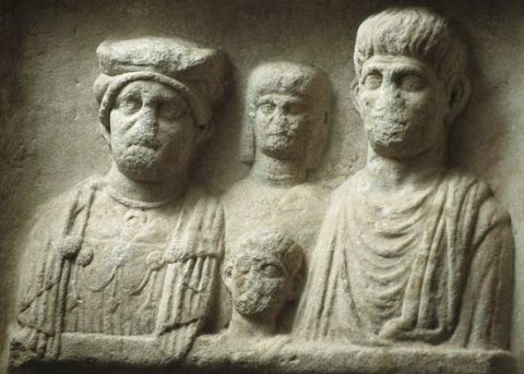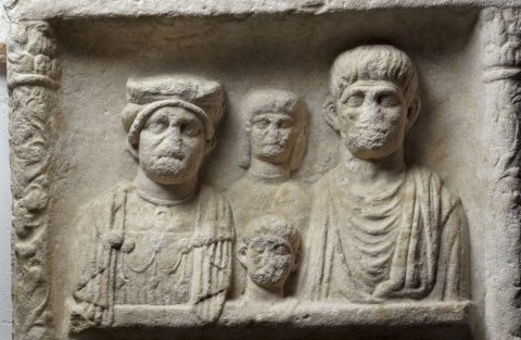 - Familie: zwischen Rankensäulen Brustbilder eines Ehepaares mit zwei Kindern. Links einheimische Frau: Haube, Umhang, Fibeln, Halsband mit Lunula, Brustschmuck. Rechts Mann: bärtig, Sagum. In der Mitte oben Mädchen: offenes Haar, Halsreif, Umhang. Davor Knabe.
