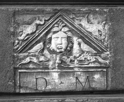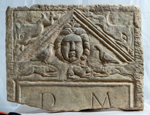 - Eingeschriebener Giebel mit Gorgoneion zwischen Vögeln. Unterhalb Tiere: zwei Hunde jagen einen Hasen. Auf den Giebelschrägen Delphine.