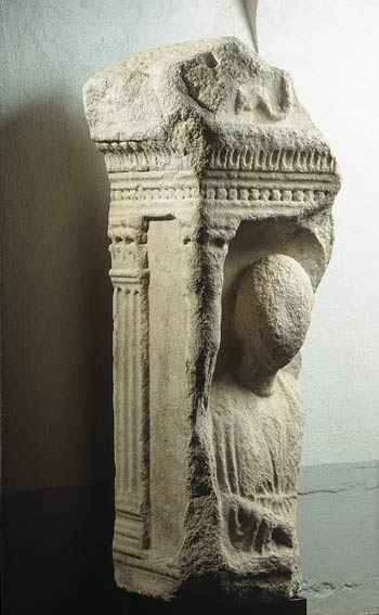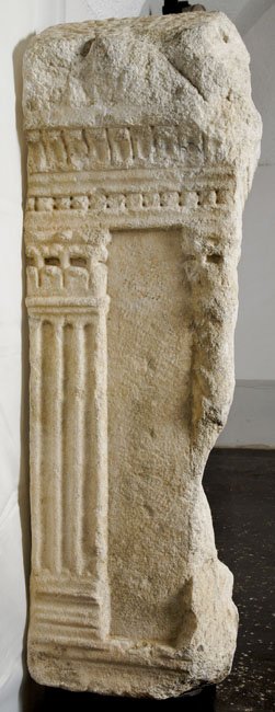 - Giebel mit Gorgoneion. Im Hauptbild zwischen Säulen Brustbilder (Ehepaar ?). Links Frau. Oben profiliertes Gesims mit Astragalfries. Auf der linken Nebenseite kannelierter Pilaster.