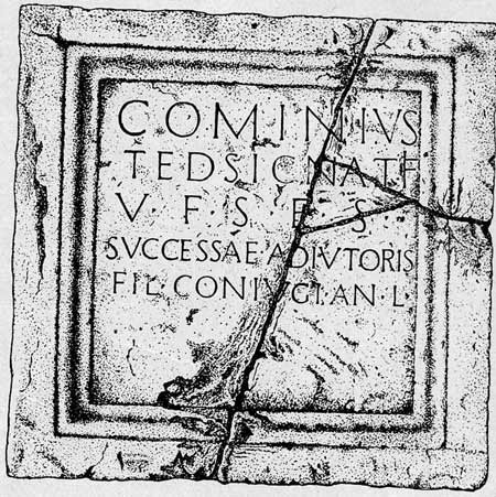 - Cominius / Tedsicnati f(ilius) / v(ivus) f(ecit) s(ibi) et s(uis) / Successae Adiutoris / fil(iae) coniugi an(norum) L