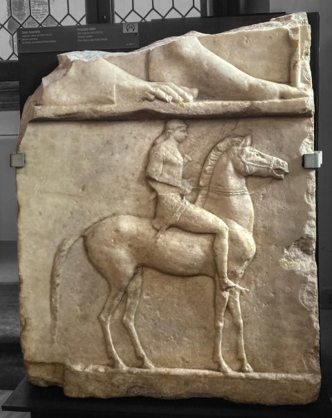 - Im Hauptbildfeld nach rechts hin stehender Mann (nur nackte Füße erhalten). Im Sockerlbild Reiter im kurzen Chiton auf gezäumtem Pferd nach rechts. Waffen: zwei Speere, Schwert.