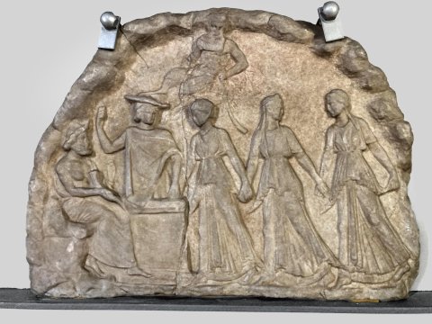 - Mythische Figuren: in einer Felsgrotte führt Hermes in Mantel und Petasos drei Nymphen in archaistisch stilisierten Gewändern auf einen Altar zu, an dem eine bärtige, gehörnte Gottheit (Acheloos) mit Füllhorn sitzt. Darüber gelagerter Pan mit Syrinx und Lagobolon. Inschrift seitlich vom Pan.